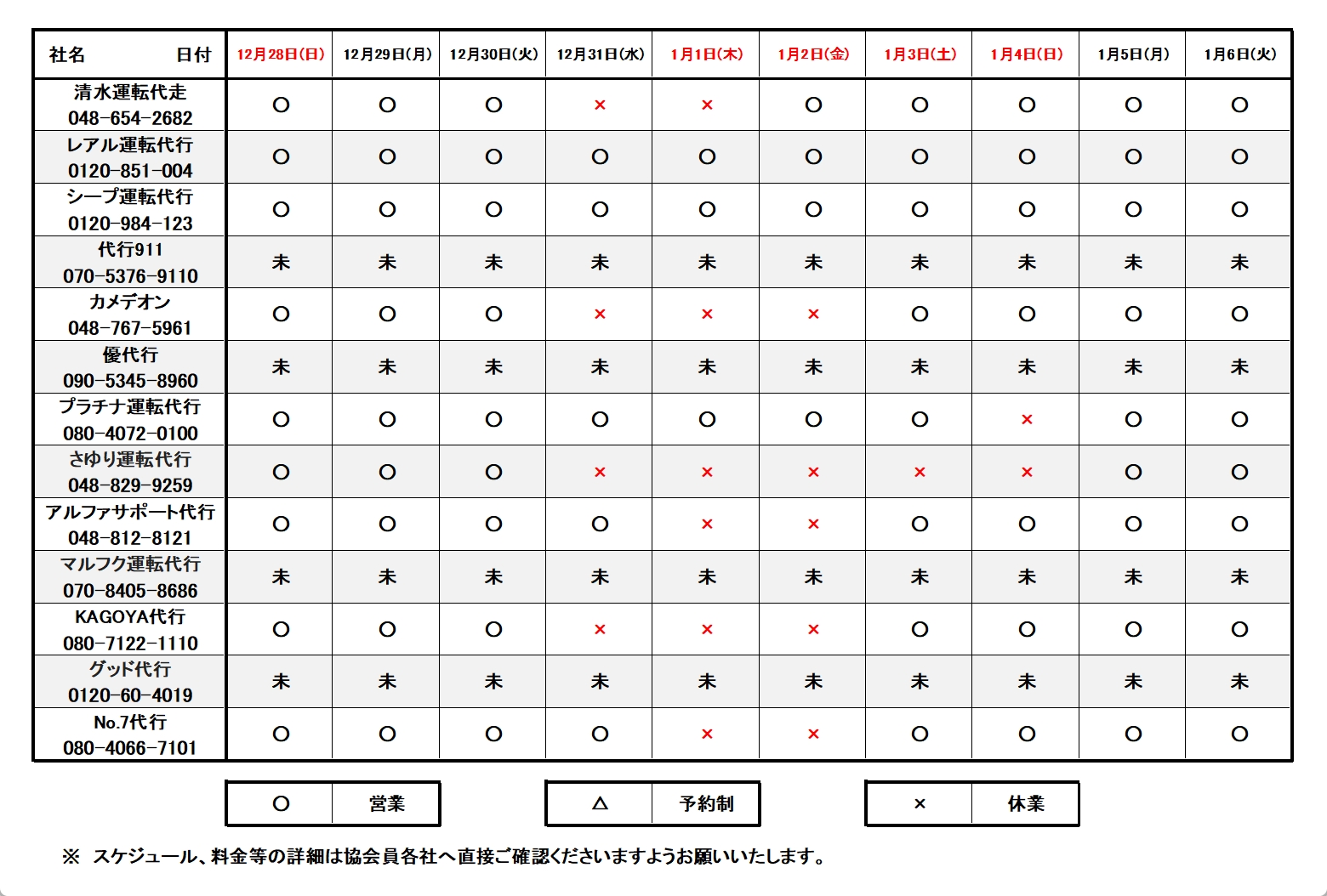 さいたま市運転代行協会は「KEEP38プロジェクト」に賛同いたします。KEEP38プロジェクトとは 県内における横断歩行者の事故撲滅を目指し、横断歩道における歩行者優先義務が規定された「道路交通法第38条」の交通ルールを正しく理解し、その遵守を表明して模範運転をすることにより、歩行者優先の機運を高め、安全運転の促進を図る取り組みです。☆ JCBタクシーチケットの取扱い開始について JCBタクシーチケットのご利用が出来るようになりました。 詳しくは左のメニューのお知らせをご覧ください。★★ 令和8年年末年始各社予定表 ★★協会員 13社(2025年12月16日現在) エアクル代行アプリ対応 JCBタクシーチケット対応